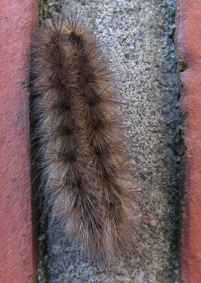 Zimna pogoda sprawiła, że motyle się schowały, z wyjątkiem jednego A. flavicornis, który na osiedlu siedzi w tym samym miejscu na murze już piąty dzien, pomimo wiatru i deszczu. Dziś znalazłem tę gąsienicę na murku. Jest ona, jak sądzę, z rodziny Arctiidae, spróbowałem ją oznaczyć. Po porównaniu z zdjęciami na stronie K. Jonki, wyszło na Phragmatobia fuliginosa. Nie mam jednak pewności, więc proszę o potwierdzenie lub poprawienie tego oznaczenia. Dziękuję. Piotr.